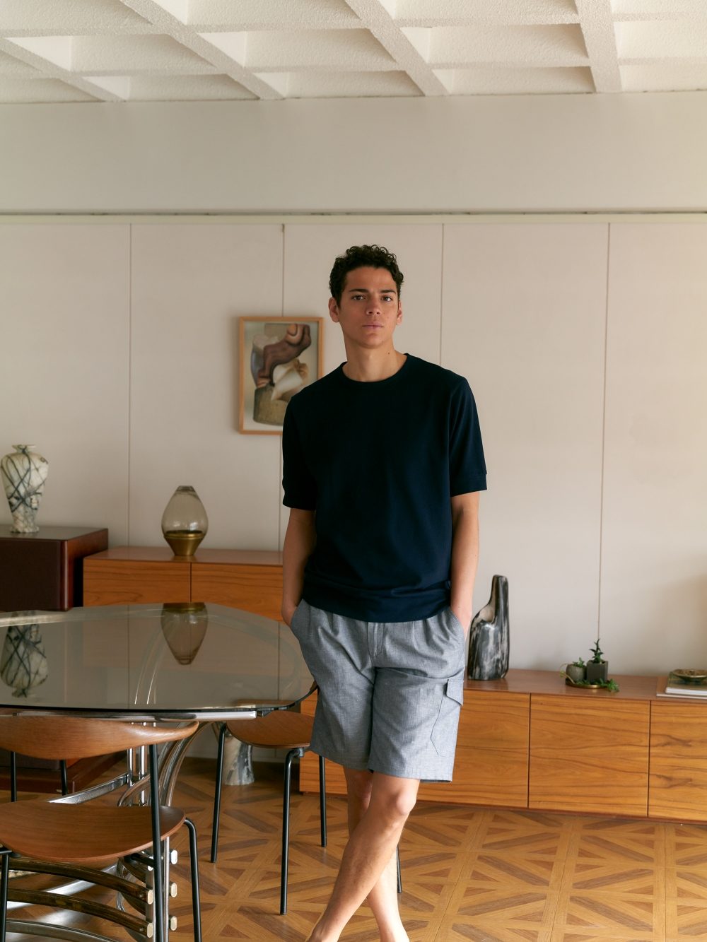 ややゆったり感のあるシルエットに対し、袖と裾のリブでメリハリ感のあるバランスに仕立てたショートスリーブクルーネックTシャツ。首回りには、綺麗にエレガントに映るよう細い二本針でバインドされ、リラックスした雰囲気の中にも気品を感じさせます。